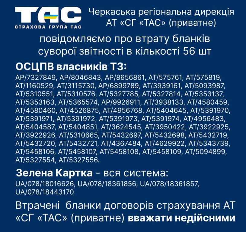 Втрачені бланки договорів суворої звітності в кількості 56шт ОСЦПВ власників ТЗ: AP/7327849, AP/8046843, AP/8656861, AT/575761, AT/575819, AT/1160529, AT/3115730, AP/6899789, AT/3939109 AT/5310551, AT/5310576, AT/5327785, AT/5327814, AT/5353137, AT/5353163, AT/5365574, AP/9926911, AT/394893 AT/4580460, AT/4526875, AT/4956768, AT/5404645, AT/5391970, AT/5391971, AT/5391972, AT/5391973, AT/53983, AT/5404587, AT/5404851, AT/3624545, AT/3950422, AT/3922925, AT/3922926, AT/5310665, AT/5432697, AT/543154 AT/5432720, AT/5432721, AT/4367484, AT/4629922, AT/5343739, AT/5458106, AT/5458107, AT/5458108, AT/548890, AT/5327554, AT/5327556. Зелена Картка вся система: UA/078/18016626, UA/078/18361856, UA/078/18361857, UA/078/18443170 страхування АТ "СГ "ТАС" (приватке) вважати недійсними. |